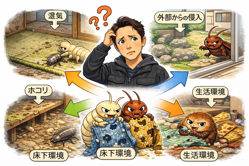 湿気、ホコリ、床下環境、生活環境、外部からの侵入など、複数の要因が重なって発生しています。